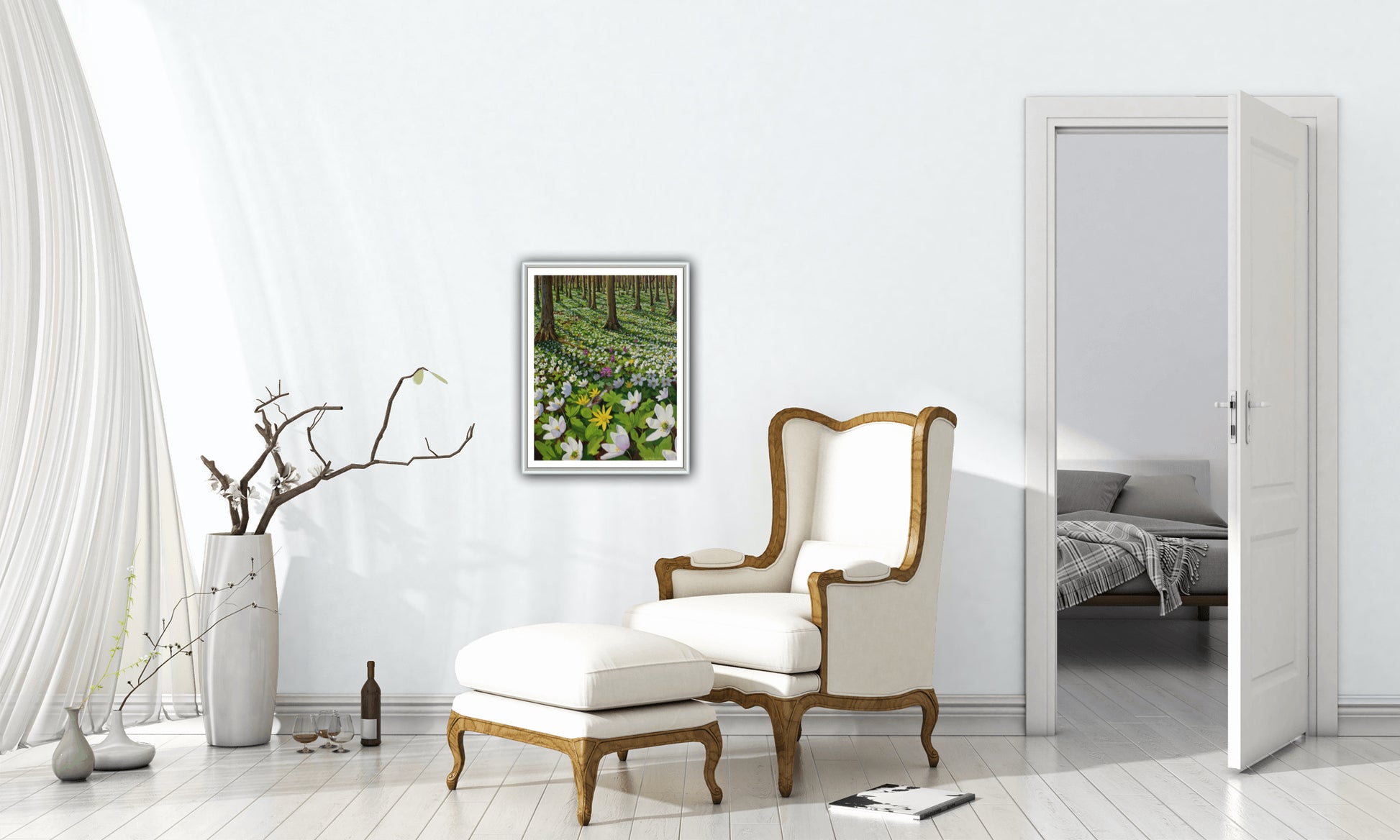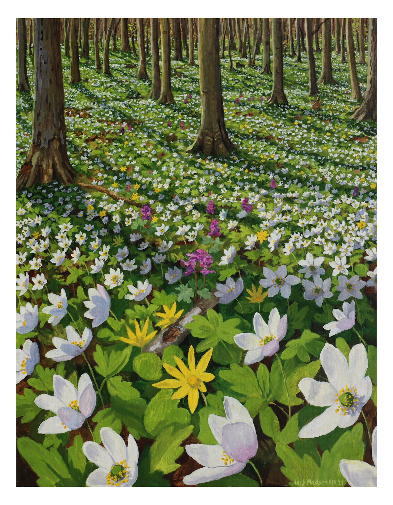 Denne skønne anemoneskovbund er et af min fars klassiske motiver. Originalen består af tre separate malerier, der både kan hænge alene som et selvstændigt billede, eller ved siden af hinanden som et samlet værk. Ønsker du at købe dem alle tre samlet, skal du gå ind under Anemoneskov samlet, hvor de passer sammen i størrelse.