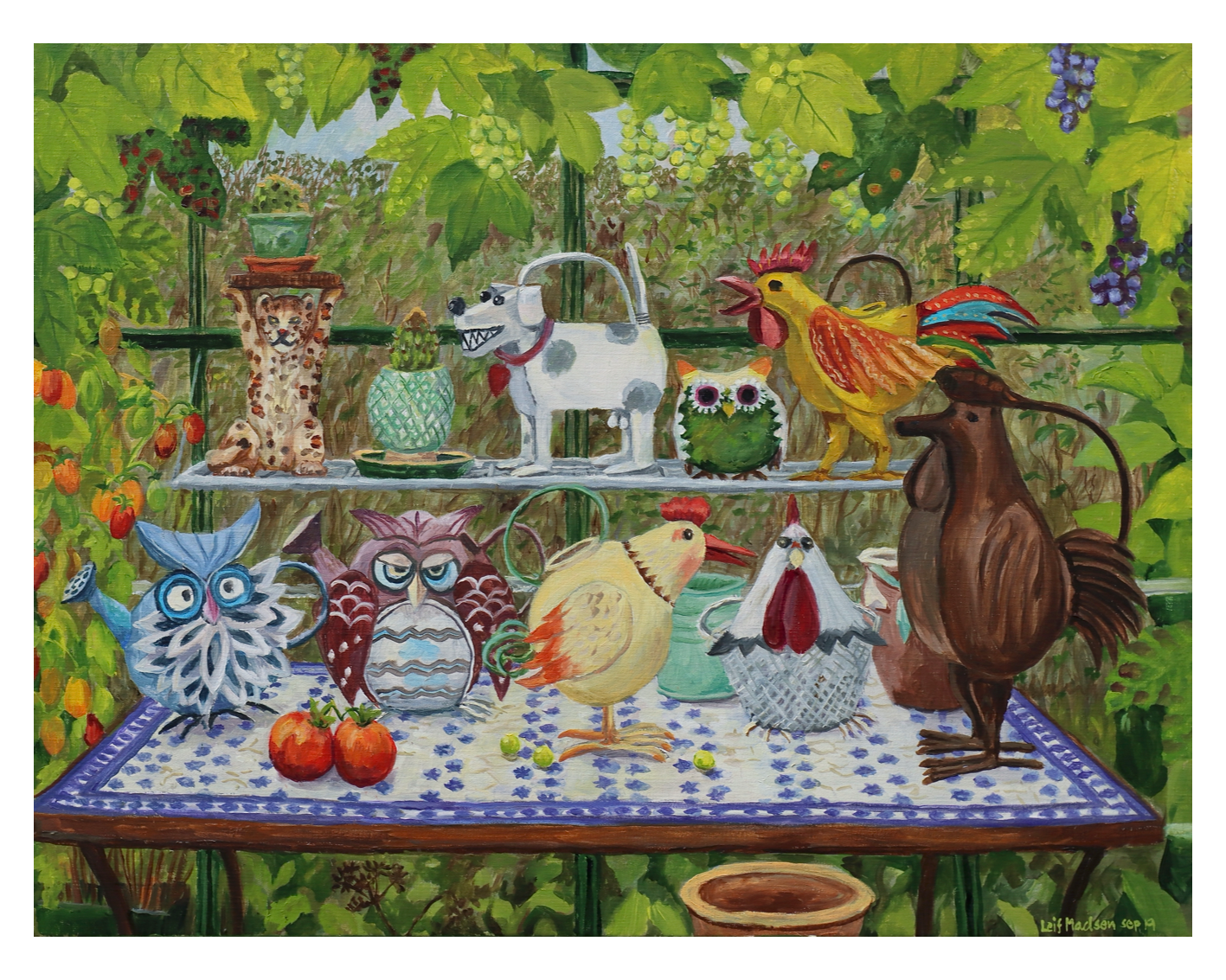Min mor samler på skøre vandkander, og hun har lavet den fineste udstilling i sit drivhus. Min far kunne ikke stå for at male et billede af hendes værk, og det er endt med at få en fremtrædende plads i stuen. Jeg kan ikke undgå at trække på smilebåndet og blive i godt humør af de smukke farver.