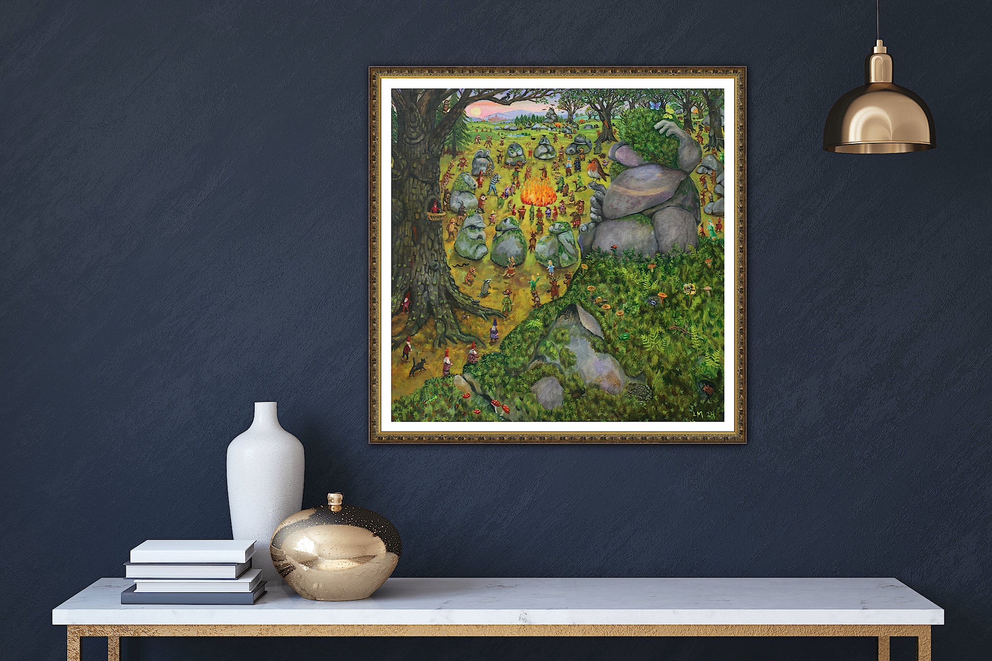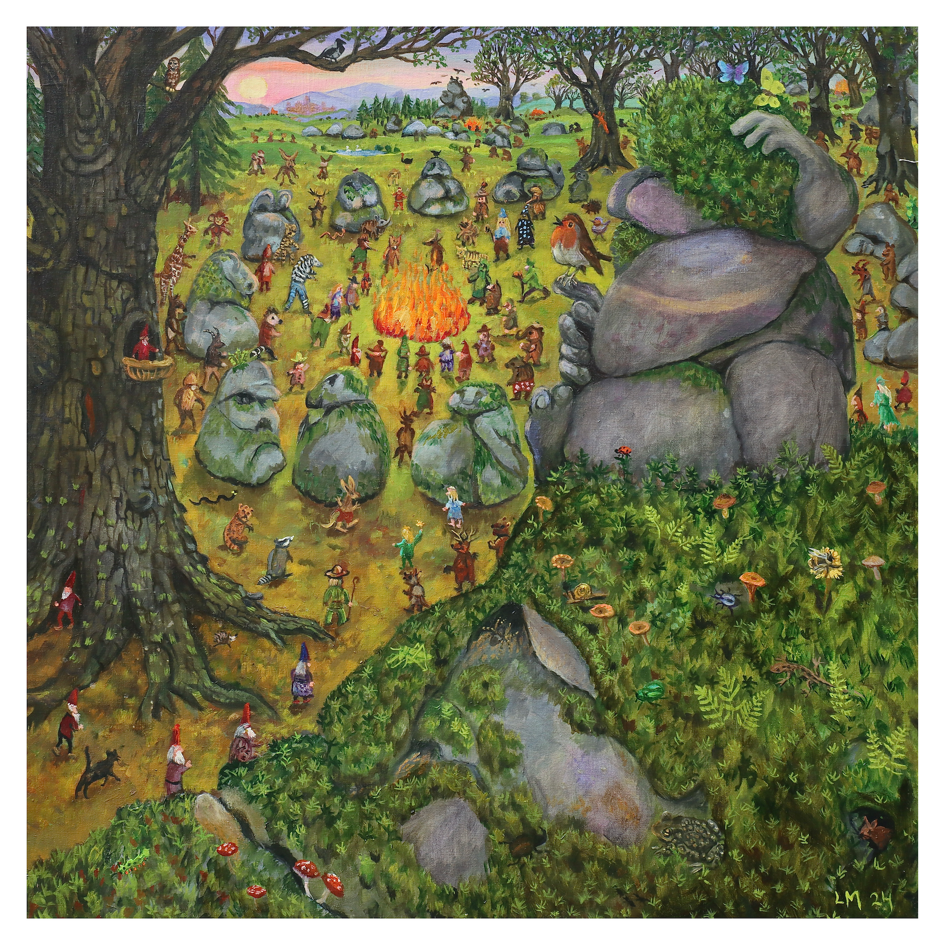 Der er fest i Troldeskoven og alle er inviteret! Et skønt eventyrbillede, som min far malede i vinteren 2023. De fleste eventyrbilleder fra den vinter, er inspireret af de ældgamle sten, han malede i Sverige samme efterår.
