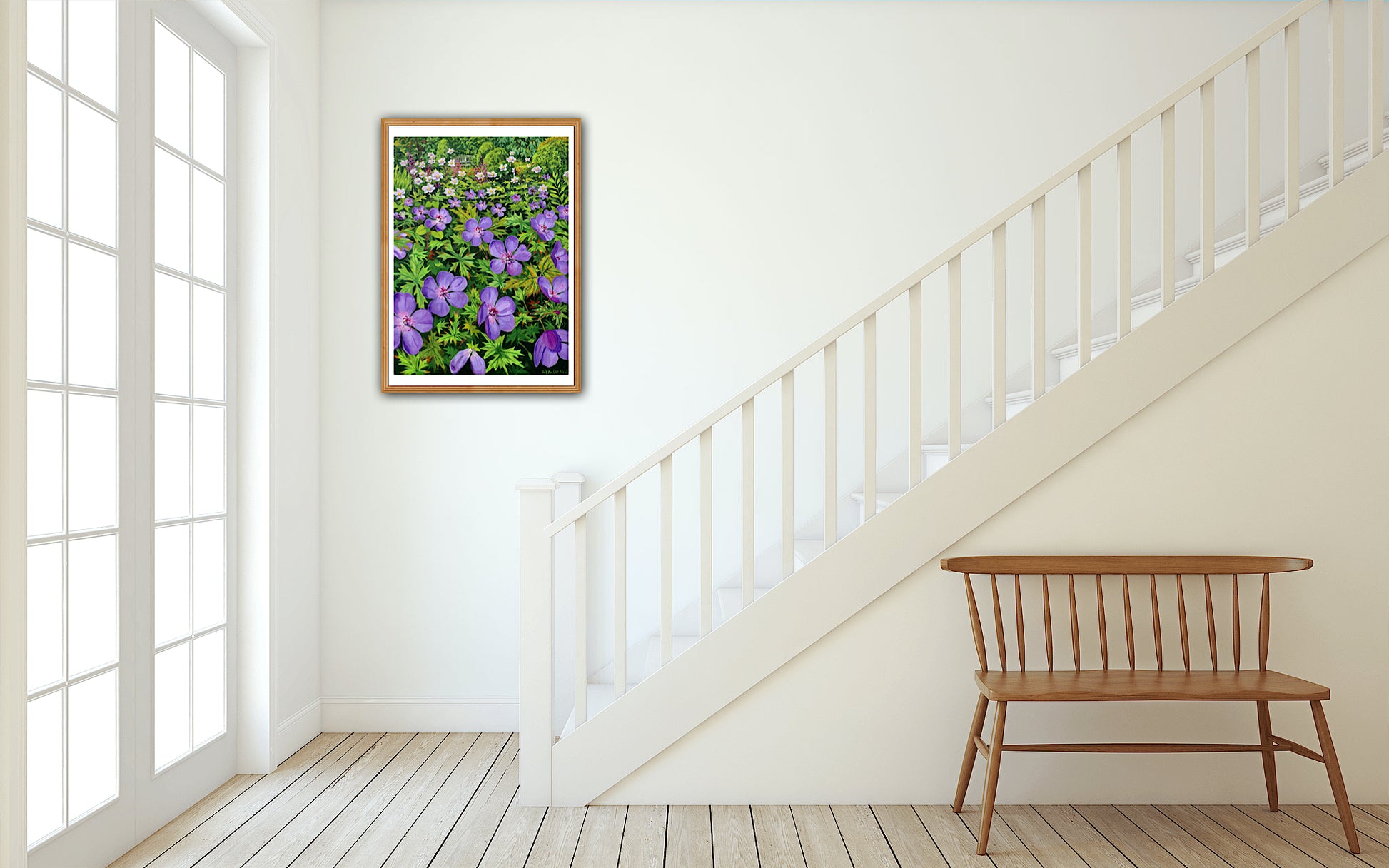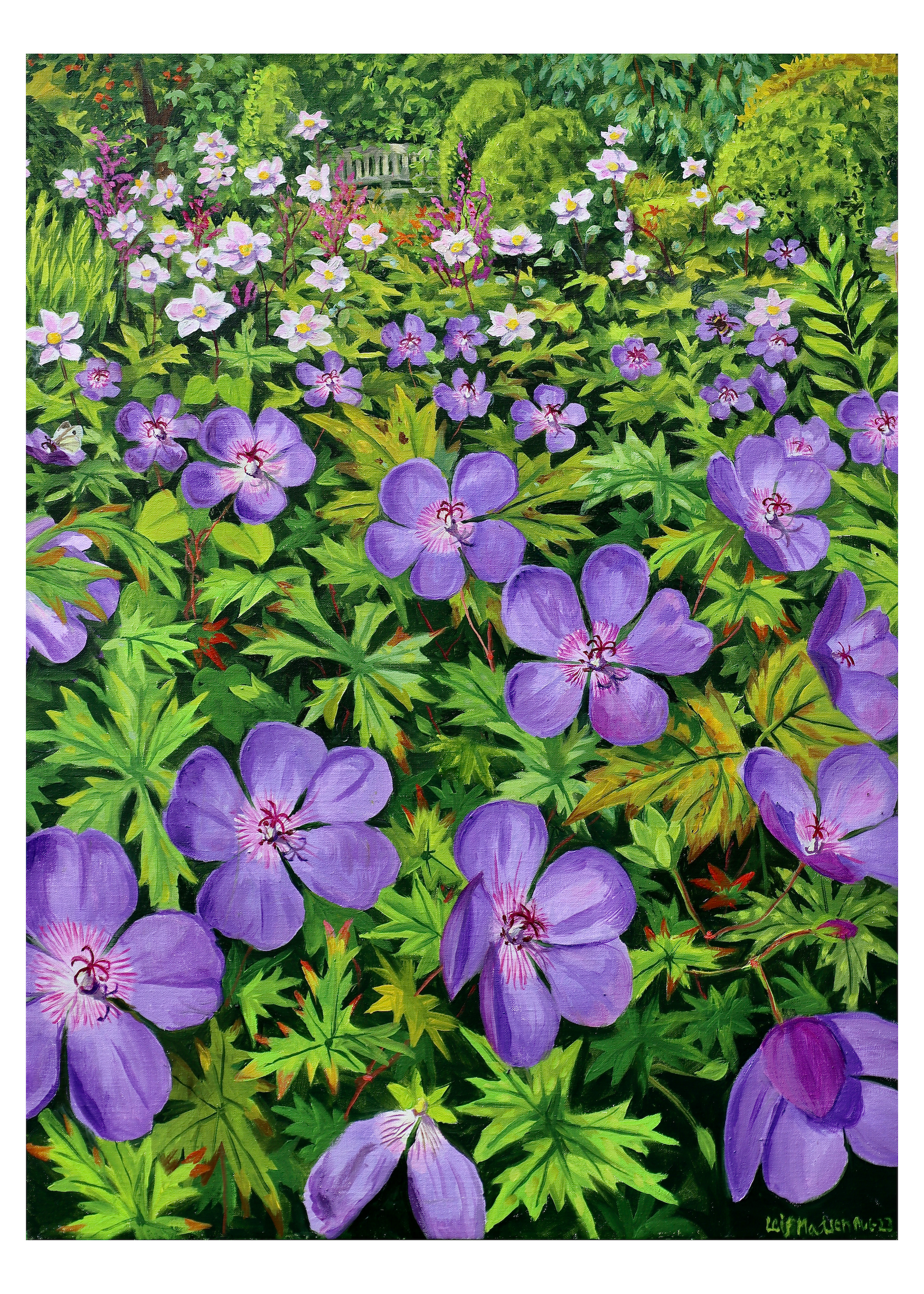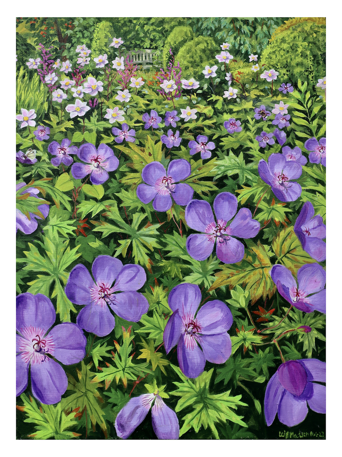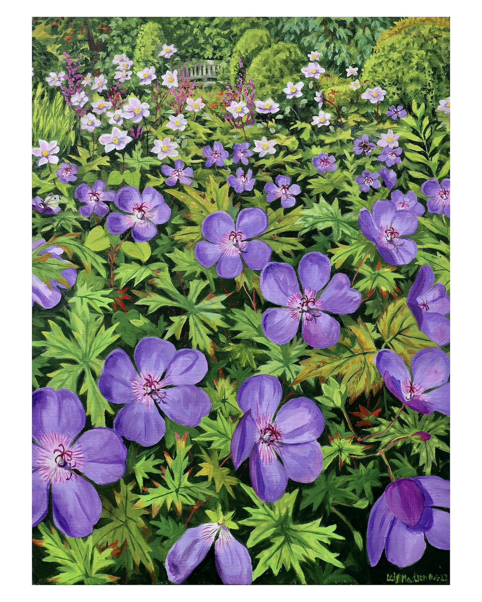Et dejligt, farvestrålende motiv med lilla geranium, som min far malede i sin have i sensommeren 2023. Insekterne nyder godt af den lange blomstringstid, og der vokser geranium eller storkenæb, som de også kaldes, i forskellige farver mange steder i haven.