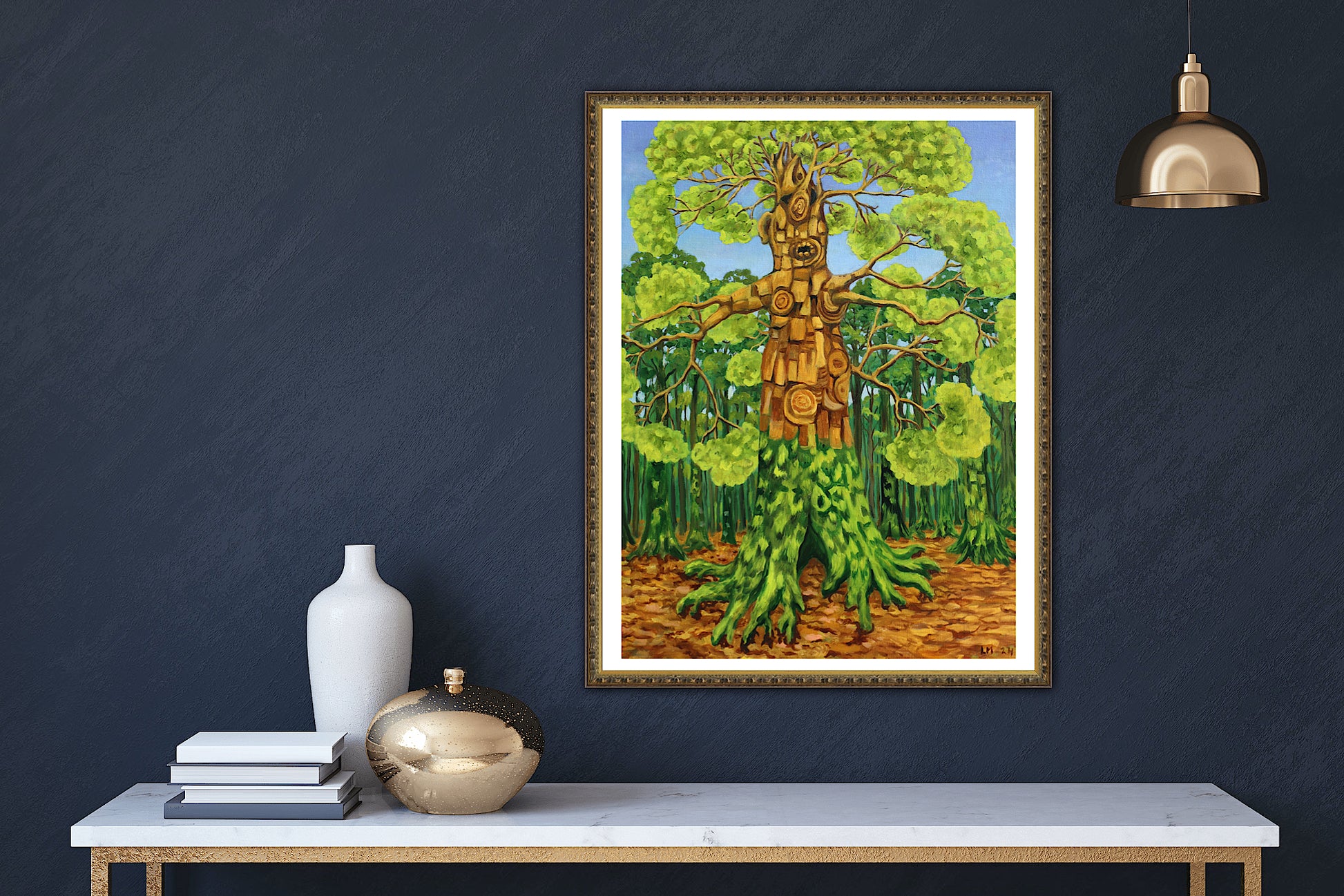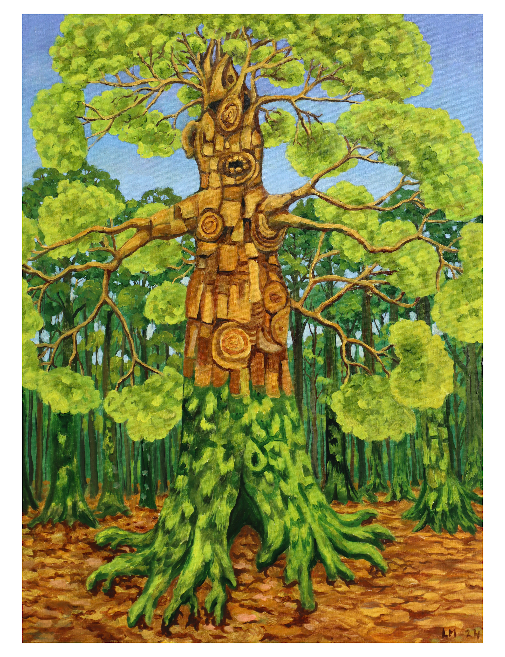 Min far er heldig, når han får et glimt af skovens hemmelige beboere i ny og næ. Her har han malet det store træ, der står midt i skoven og passer på de andre træer. Man skal nok ikke komme for tæt på uden at spørge om lov først.
