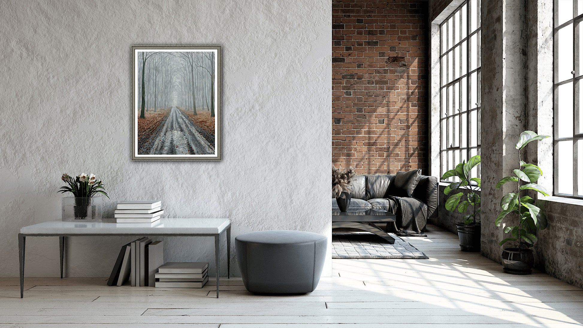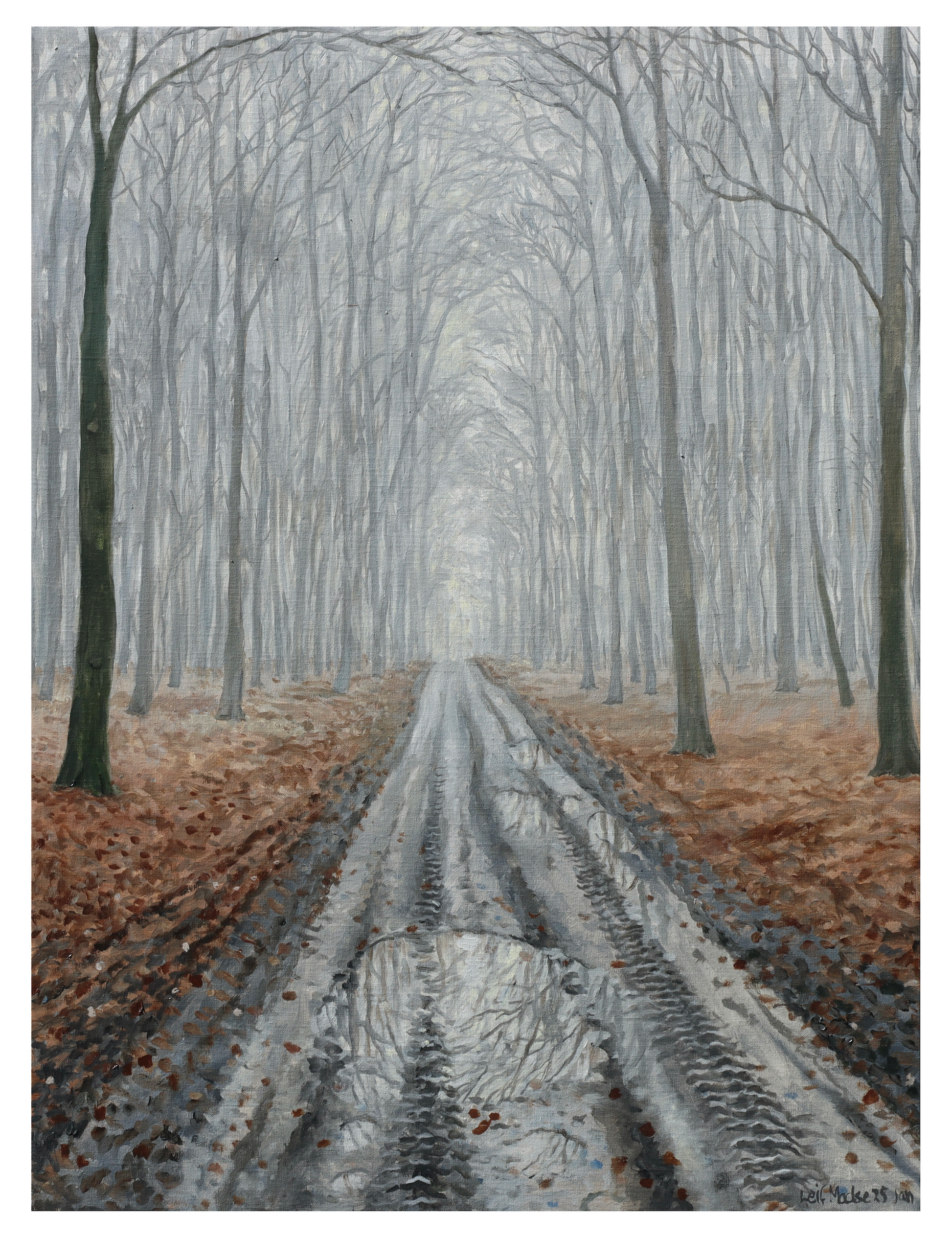 Min far maler ikke så mange billeder udendørs om vinteren, men så en gang i mellem falder han alligevel over et motiv, han ikke kan lade være med at forevige. Som for eksempel dette kig ned gennem skovvejen på en tåget dag i januar. Jeg elsker farverne og lyset i motivet - man kan næsten mærke, hvor koldt og klamt, det må føles at være der.