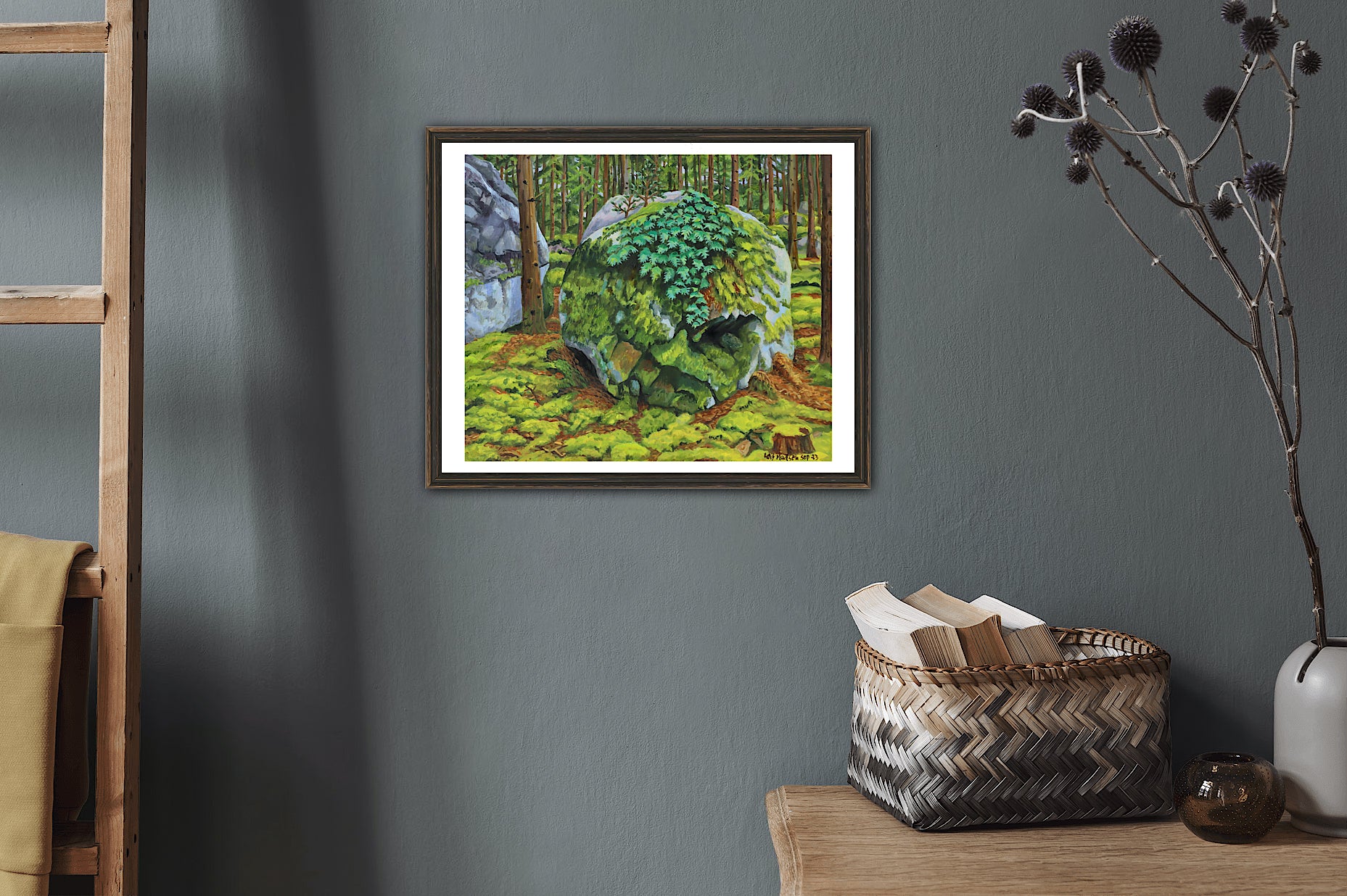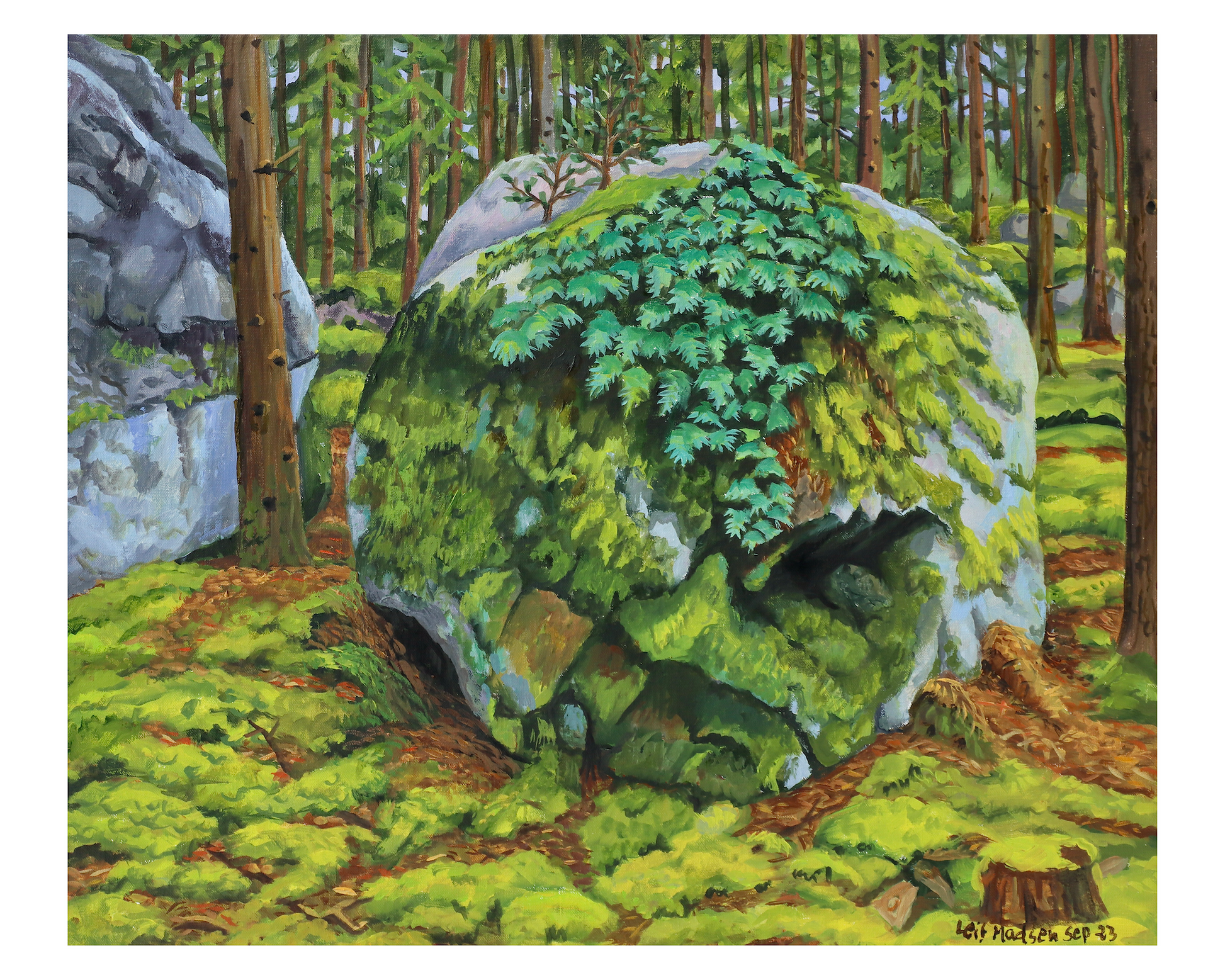 I sensommeren 2023 var min far i Sverige for at besøge sin gode ven, Peter Severin, der også er kunstner. Peter bor i et naturskønt område, tæt på skoven, hvor min far havde set nogle store, ældgamle sten, han havde lyst til at male. Det blev til en del malerier af forskellige sten, der, senere på året, inspirerede ham til at male nogle sjove eventyrbilleder. Dette er det andet i en række sten-malerier, jeg udgiver løbende.