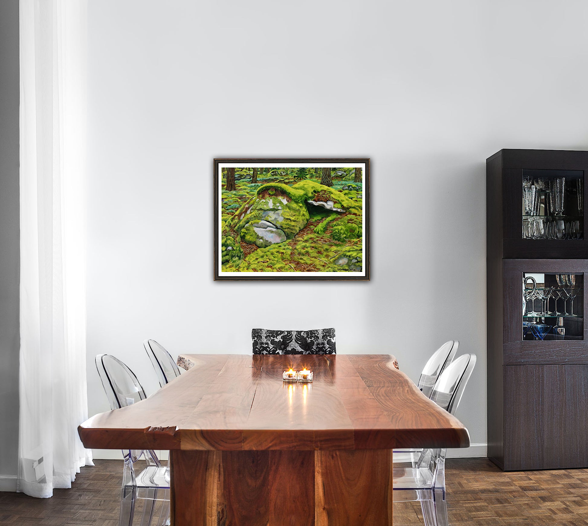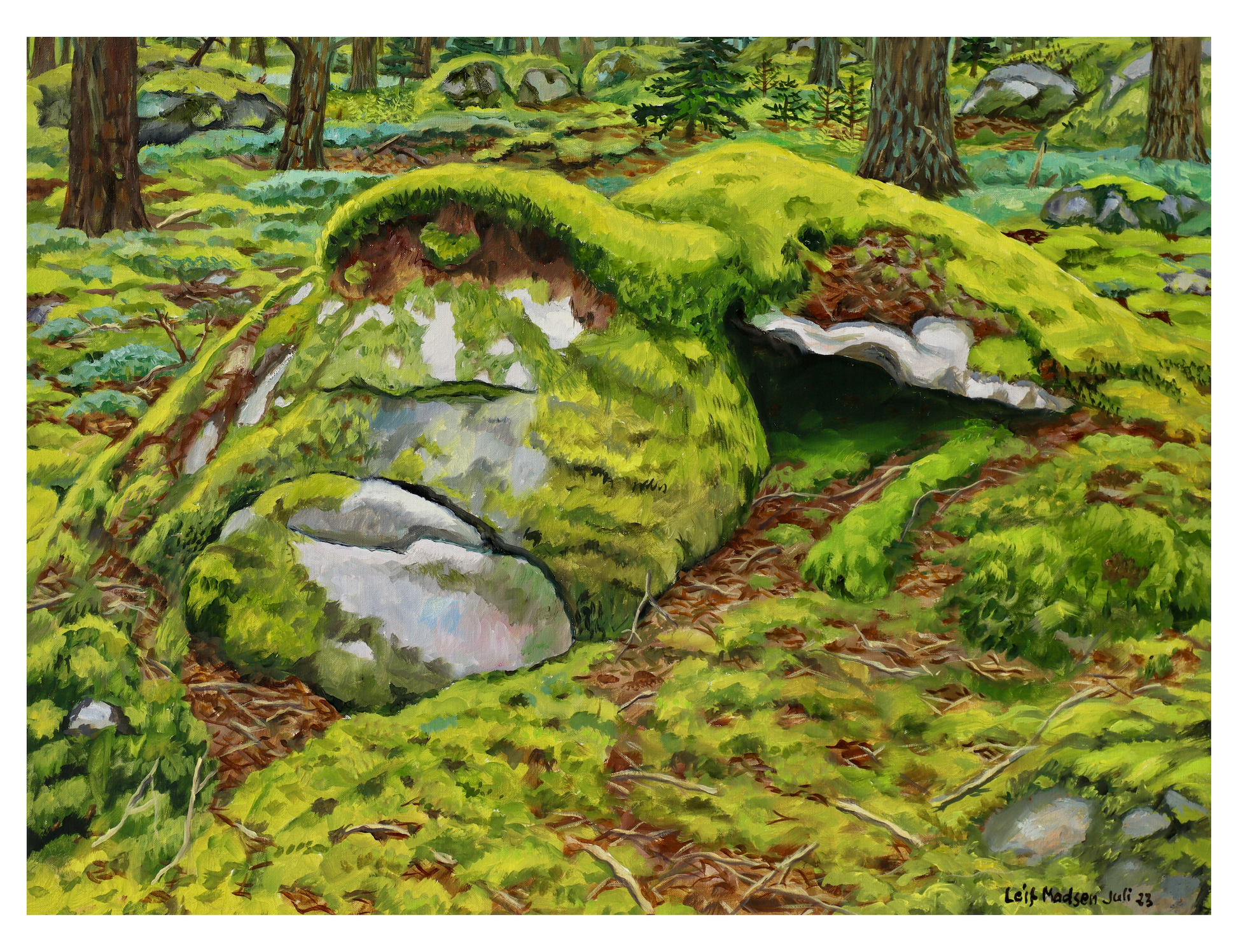 I sensommeren 2023 var min far i Sverige for at besøge sin gode ven, Peter Severin, der også er kunstner. Peter bor i et naturskønt område, tæt på skoven, hvor min far havde set nogle store, ældgamle sten, han havde lyst til at male. Det blev til en del malerier af forskellige sten, der, senere på året, inspirerede ham til at male nogle sjove eventyrbilleder. Dette er det første i en række sten-malerier, jeg udgiver løbende.