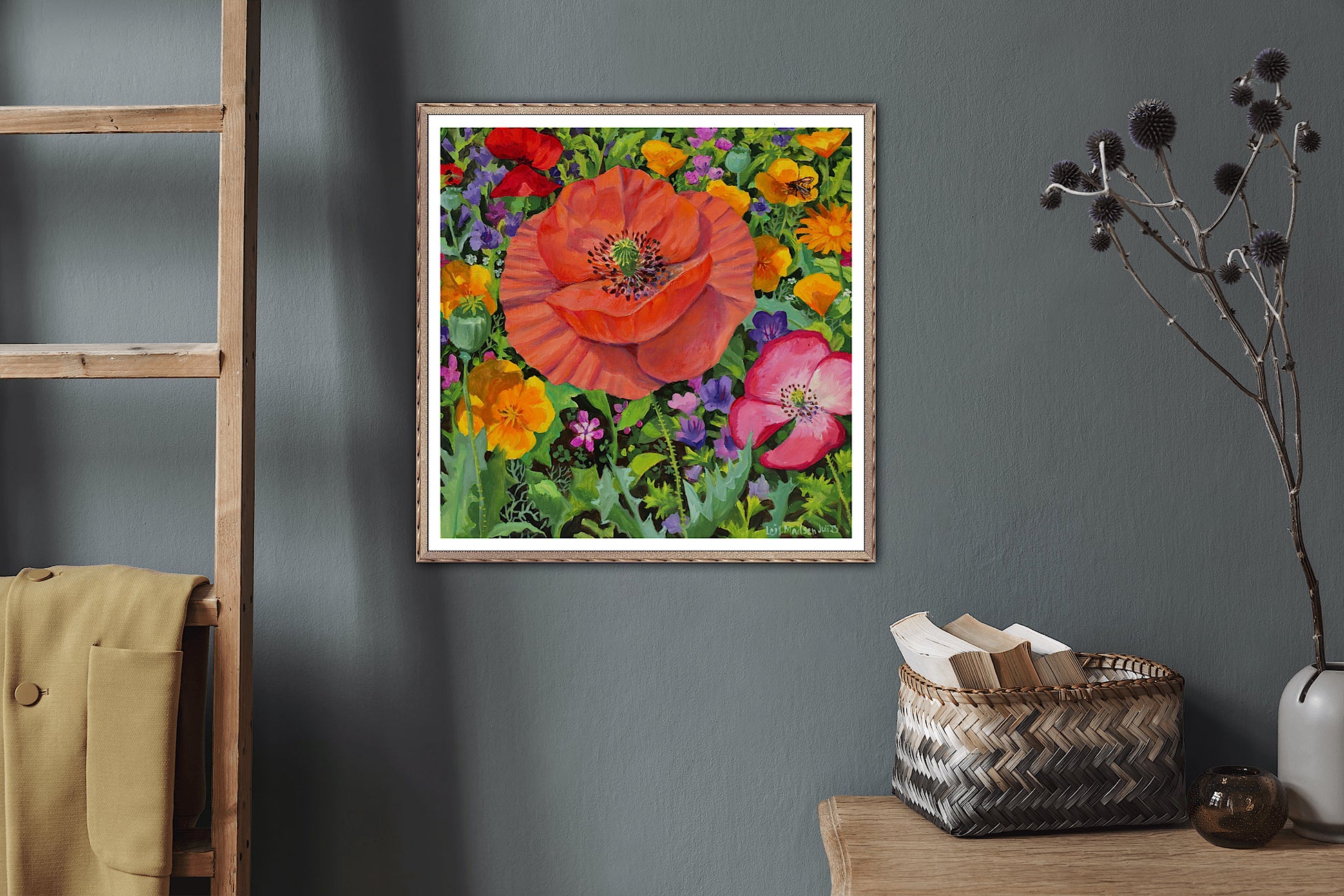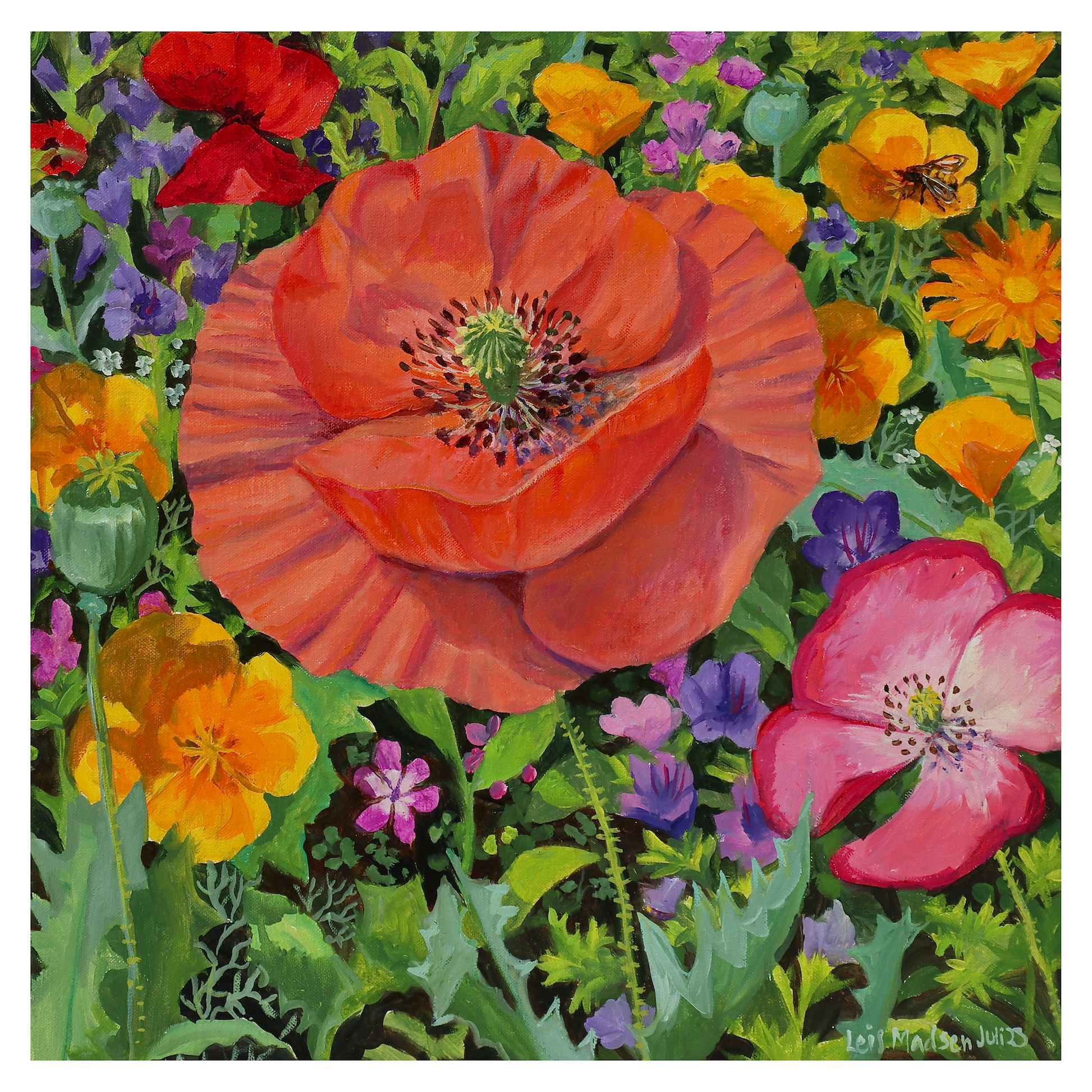 Et portræt af en rød valmue midt i et bed med sommerblomster. Min far plantede selv blomsterne, og det blev til mange motiver henover sommeren det år.