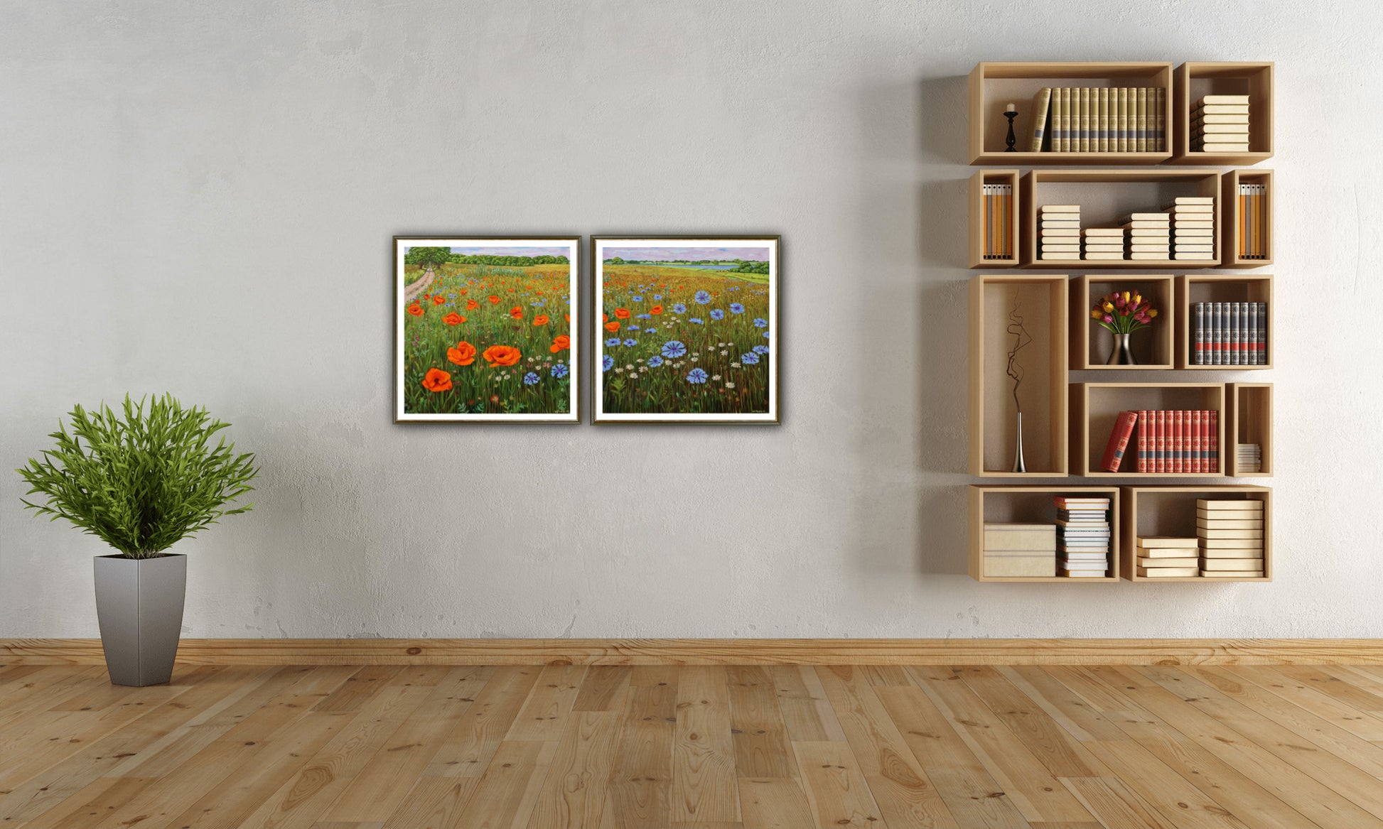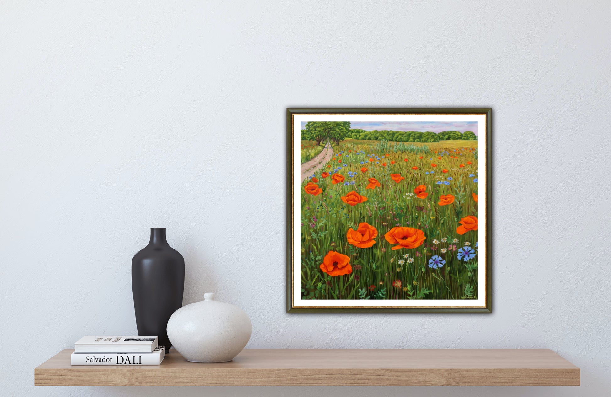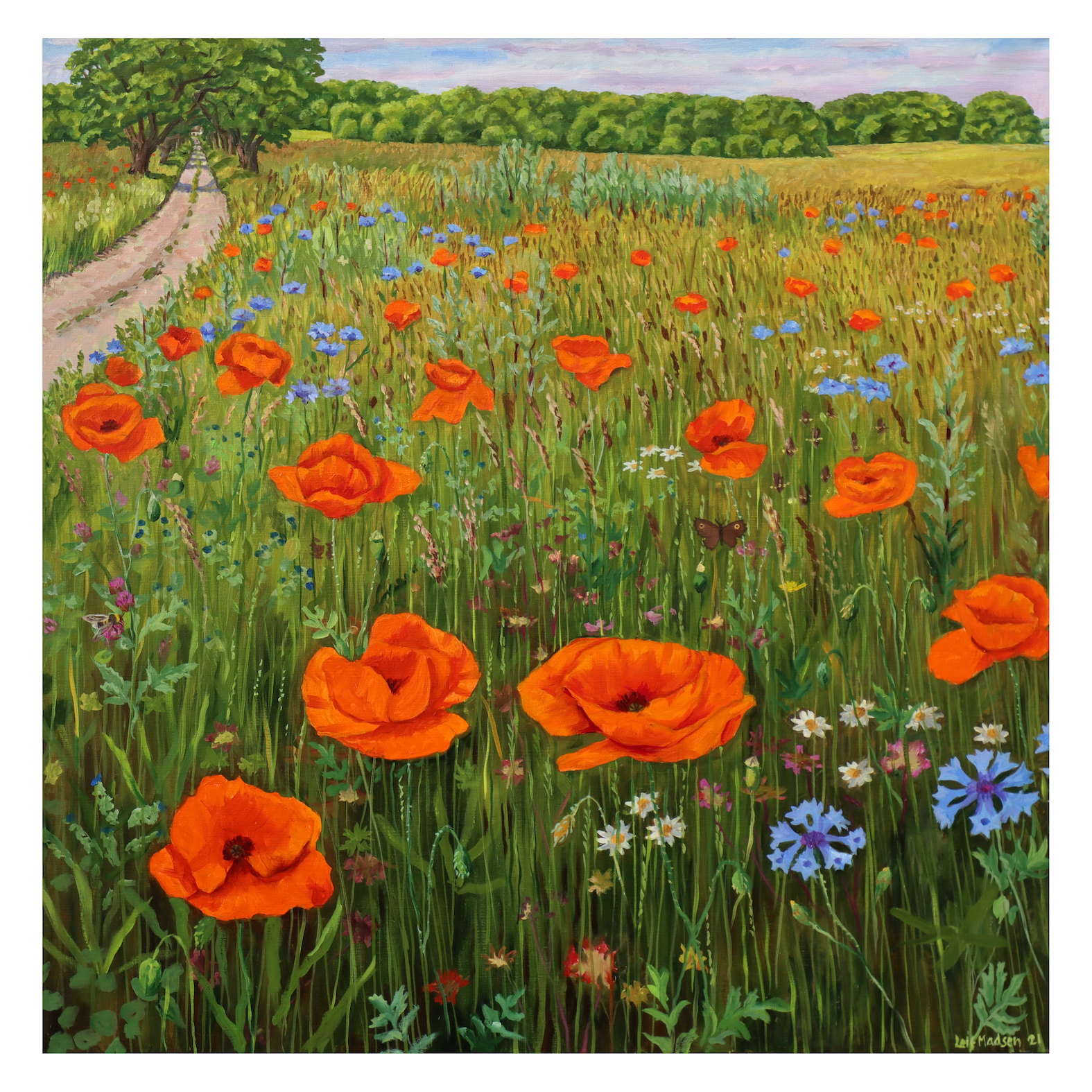 Billedet her er indbegrebet af dansk sommer for mig. Kornblomster, valmuer og kamille i kanten af kornet. Originalen er malet ikke ret langt fra mit hjem, hvor der er udsigt til vandet. Maleriet er den ene del af to separate malerier, valmuemark A & B, der kan sættes sammen til et samlet værk.