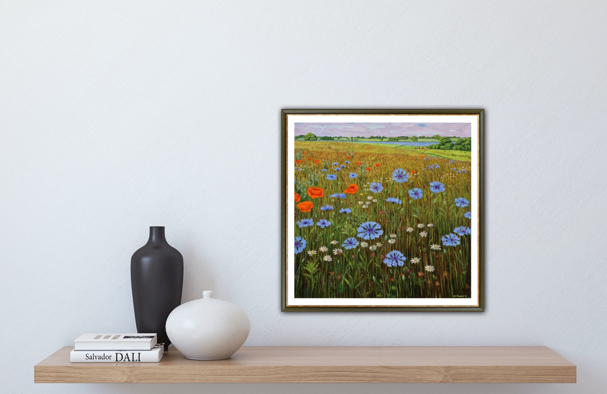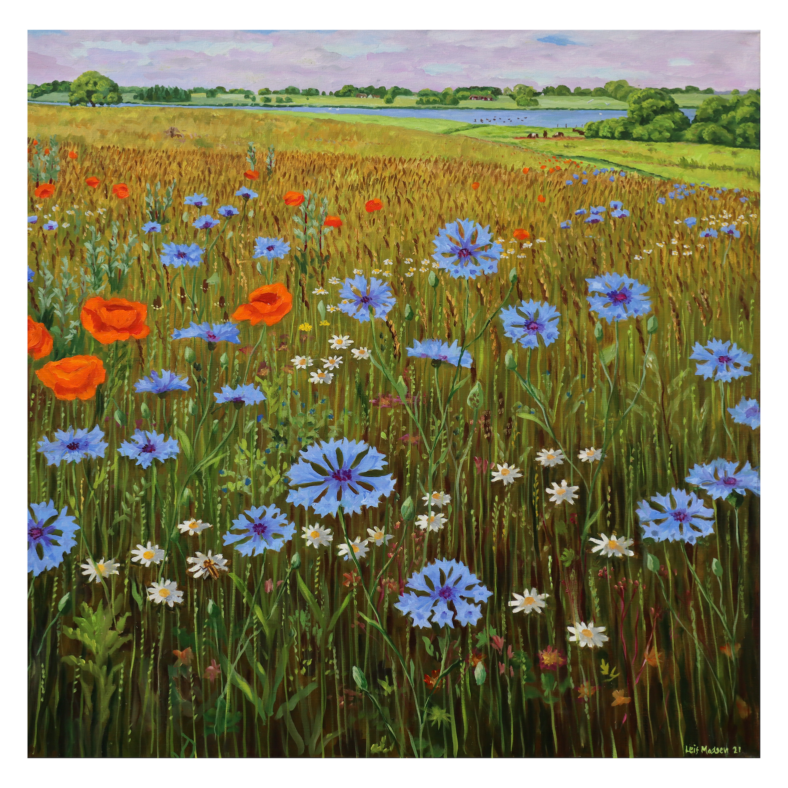Billedet her er indbegrebet af dansk sommer for mig. Kornblomster, valmuer og kamille i kanten af kornet. Originalen er malet ikke ret langt fra mit hjem, hvor der er udsigt til vandet. Maleriet er den ene del af to separate malerier, valmuemark A & B, der kan sættes sammen til et samlet værk.